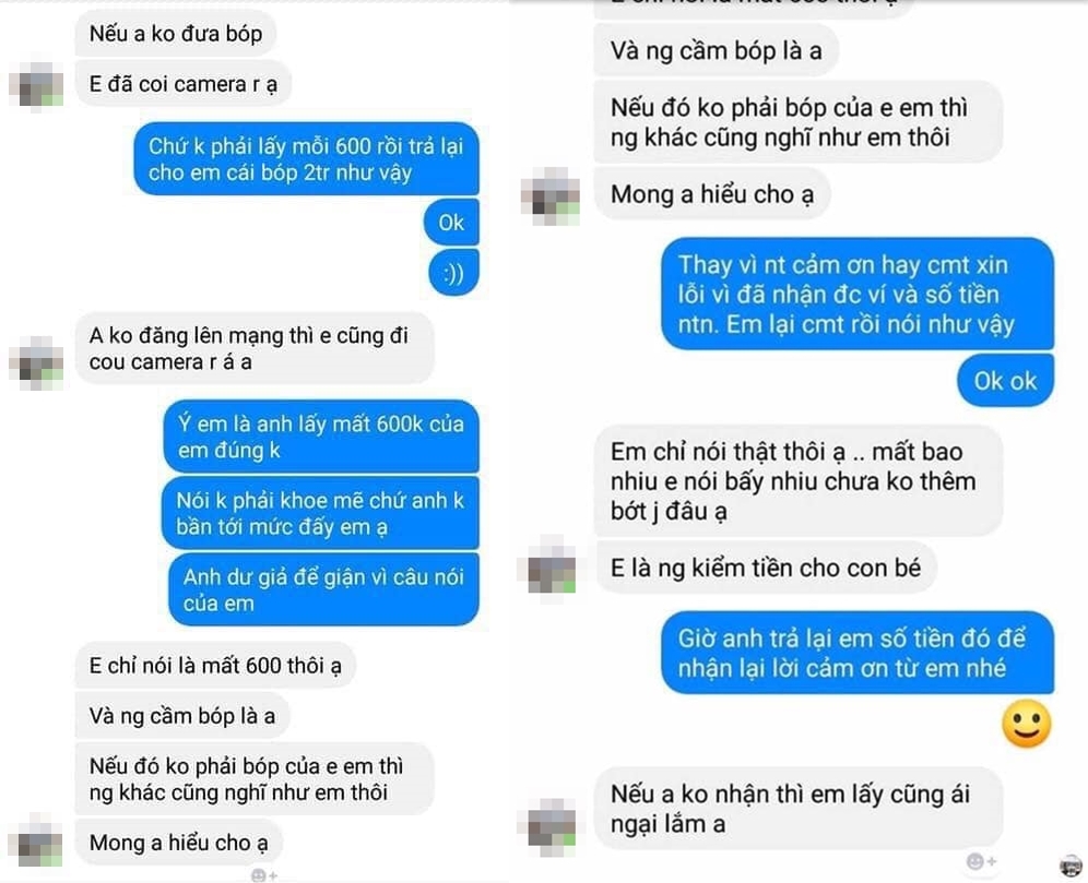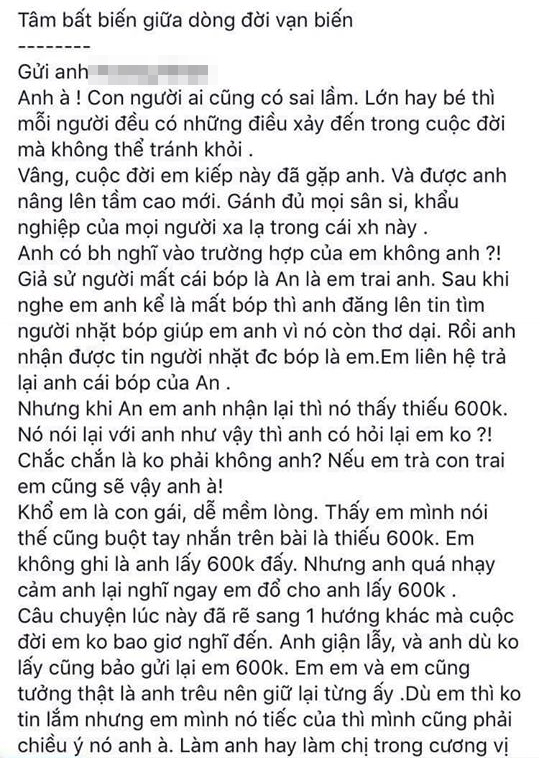 “Em có thắc mắc và nhắn tin để hỏi thì em ấy nói mình như này đây, mọi người đọc giúp em với. Xem như này phải làm ơn mắc oán không?! Và nếu như có lòng tham thì tại sao em không lấy hết mà chỉ gắp 600k thôi??? Em không phải khoe mẽ gì cả nhưng số tiền 600k đó, nó chỉ là số tiền quá bé em thường chi tiêu thôi mọi người ạ. Lần sau ai dám làm người tốt nữa đây ?!