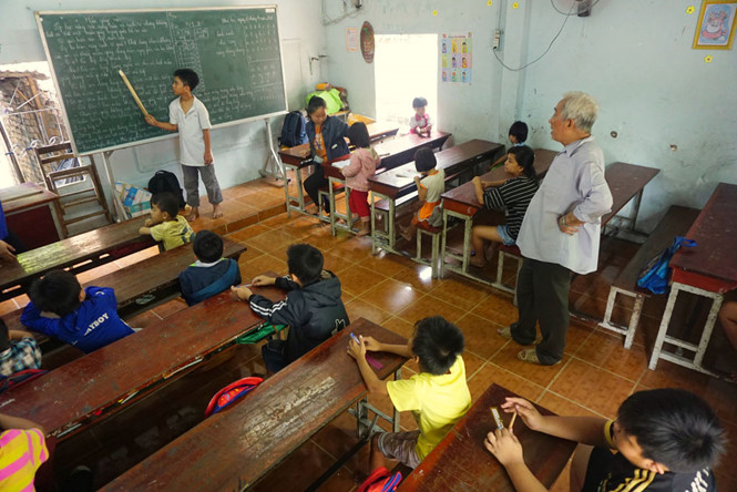Cùng ông Tư dạy học còn có các bạn sinh viên tình nguyện, mỗi người kèm cặp một bên: bên lớp Một, bên lớp Hai. Phòng bên cạnh thì lớp Ba, lớp Bốn. Mỗi phòng học đều phải chia đôi tấm bảng xanh.