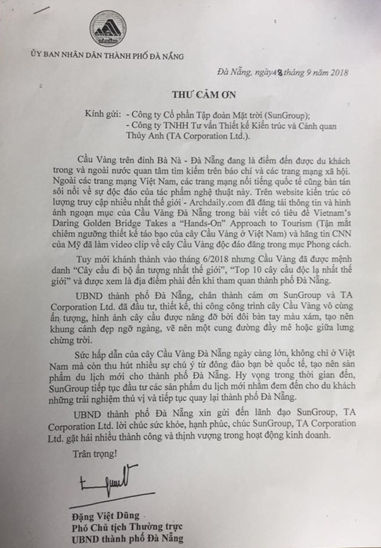 Ngày 19/9, UBND TP Đà Nẵng cho biết, Phó Chủ tịch Đặng Việt Dũng vừa gửi thư cảm ơn đến Công ty Cổ phần Tập đoàn Mặt trời (SunGroup) và đơn vị thiết kế, thi công vì đã tạo ra công trình cây cầu Vàng (Golden Bridge) huyền thoại trên đỉnh Bà Nà Hills, có sức hút ngày càng lớn với du khách.