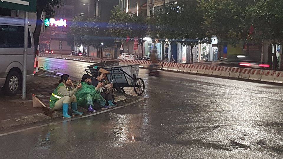 Một số nữ lao công ngồi nghỉ ngơi bên lề đường. Có lẽ rằng họ đang cầm điện thoại để tranh thủ gọi điện về cho gia đình. Ảnh Facebook Tam ngo