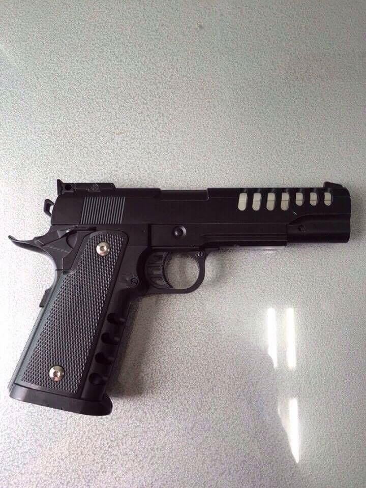 Em H. mở cặp lấy ra khẩu súng quân dụng K54 cho các bạn xem. Vô tình, H. làm súng rơi xuống nền đất, hộp tiếp đạn cũng bị văng ra. Em H. cúi xuống nhặt lên thì người bạn cùng trường là em H.Q.A (12 tuổi, ngụ huyện Củ Chi) yêu cầu đưa để xem cho biết.