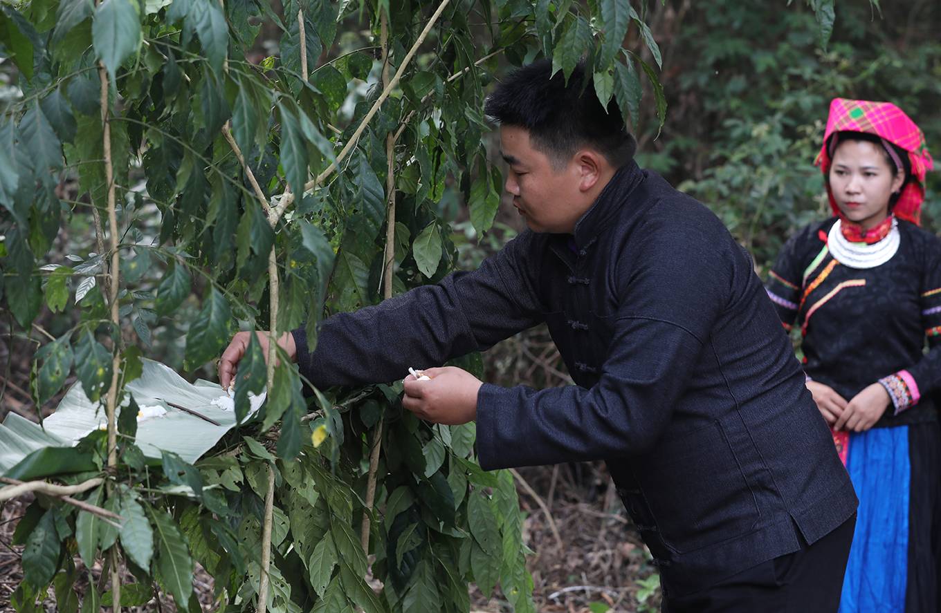 Tay cầm cành cây, thầy cúng gọi mời Thần rừng và các vị thần.