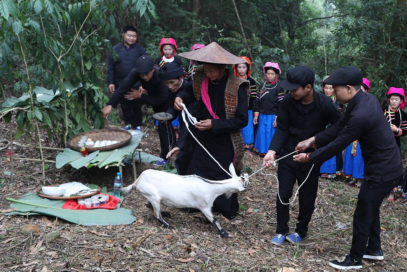 Nghi lễ cúng kéo dài chừng hai tiếng. Hai con gà và một con dê có sừng cùng nhiều đạo cụ được chuẩn bị. 30 phần cơm phần thịt trứng, rượu được chia đủ cho hai mâm lễ.