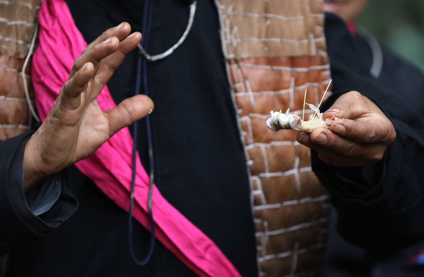 Cặp gà sau khi cúng thần sẽ được rút phần xương đùi và cắm hai chiếc tăm vào để “nghiên cứu”. Đây là nghi thức cuối cùng của buổi lễ để biết các vị thần có hài lòng với lễ cúng hay không.
