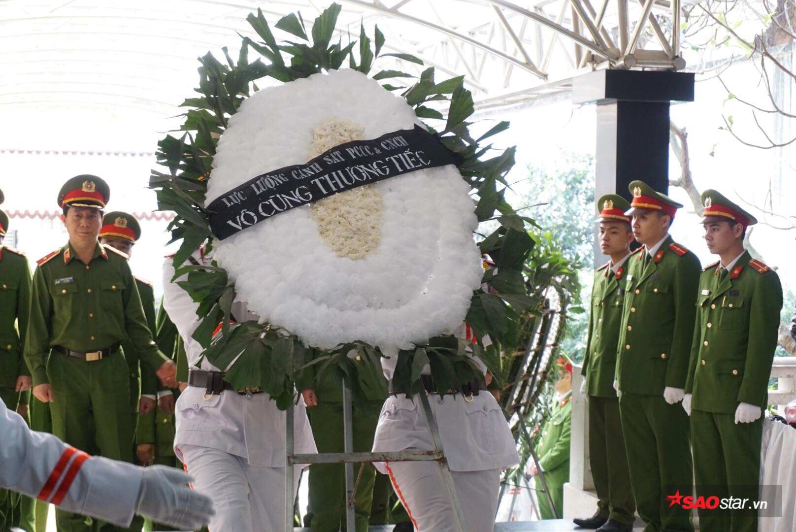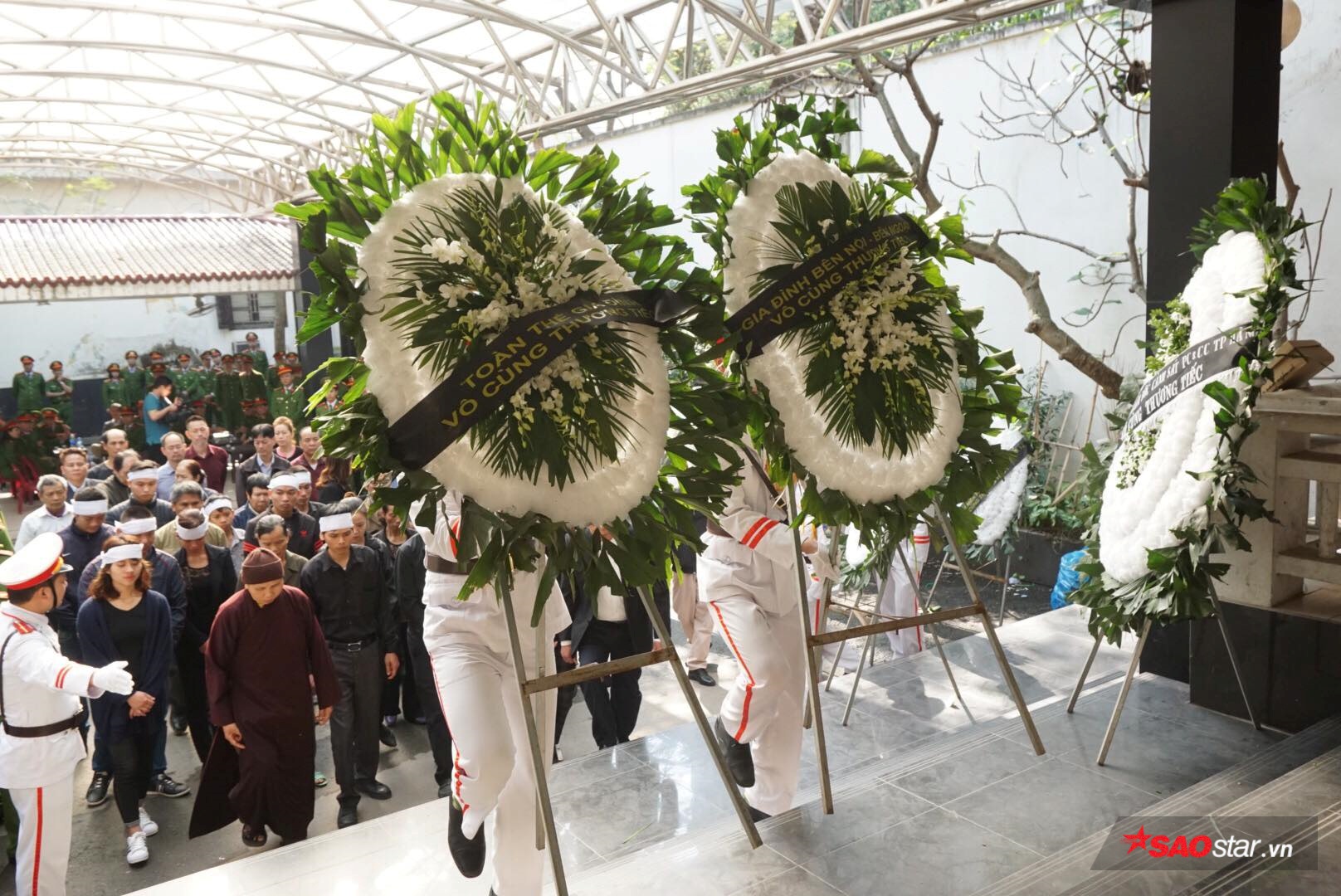Dọc hai bên lối vào nhà tang lễ xếp kín hai hàng hoa trắng. Sự hi sinh của thượng sĩ Khánh khi tuổi đời còn trẻ khiến đồng đội và người thân vô cùng đau xót.
