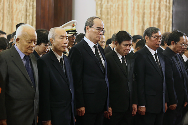 Lễ truy điệu kết thúc, lãnh đạo cùng gia đình đi vòng quanh linh cữu trong tiếng nhạc Hồn tử sĩ, nhiều người rơi nước mắt ngậm ngùi. Trong đoàn người dự lễ truy điệu có nguyên Tổng bí thư Lê Khả Phiêu, Nông Đức Mạnh; nguyên Chủ tịch nước Trần Đức Lương, Trương Tấn Sang; nguyên Chủ tịch Quốc hội Nguyễn Văn An, Nguyễn Sinh Hùng; nguyên Thủ tướng Nguyễn Tấn Dũng…