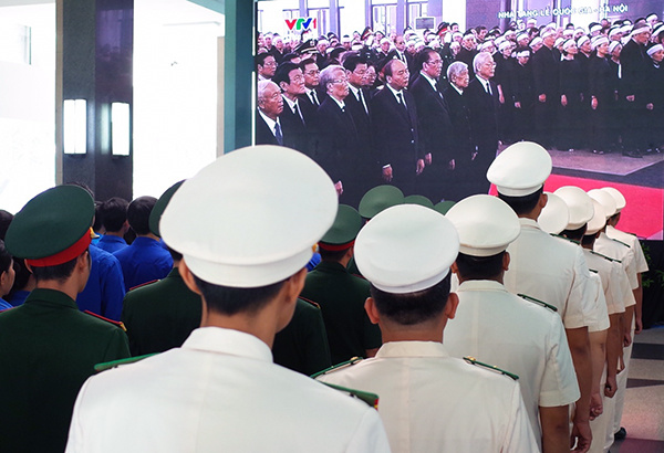 Quốc thiều được cử lên. Mọi người đứng nghiêm trang, hướng về phía linh cữu và di ảnh cố Tổng bí thư.