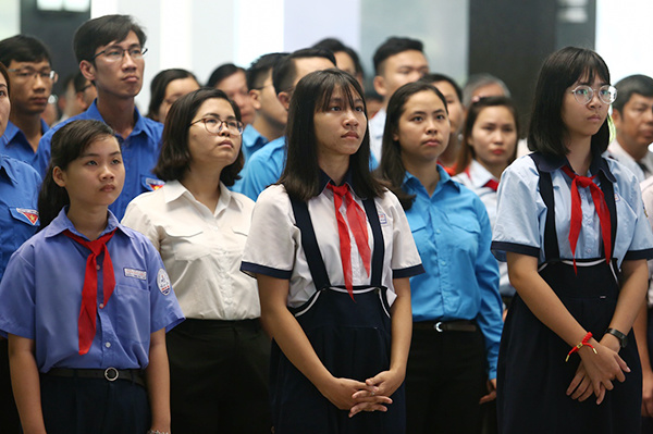 Lãnh đạo Thành ủy, UBND, HĐND, UB MTTQ Việt Nam TP HCM và các đơn vị, cơ quan ban ngành… đứng trang nghiêm, theo dõi buổi lễ truy điệu nguyên Tổng bí thư Đỗ Mười được truyền hình trực tiếp từ Nhà tang lễ quốc gia Trần Thánh Tông, Hà Nội.
