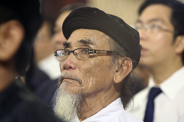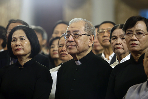 Đoàn lãnh đạo, gia quyến xếp hàng theo phía sau, tay chắp trước ngực.