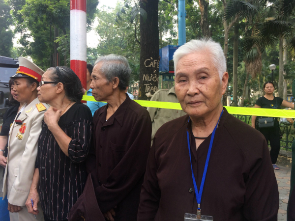 Bà Trần Tiếp Thuỷ, tóc bạc như cước, bắt xe buýt từ Bắc Giang đến Long Biên lúc 5h sáng nay. 6h30, bà đã đứng trước cổng nhà tang lễ. Bà chia sẻ lòng kính trọng các thế hệ lãnh đạo xưa như ông Đỗ Mười. Vì vậy bà muốn đến tiễn đưa người quá cố về tận nơi an nghỉ cuối cùng, cầu kinh niệm phật cho vong hồn ông được siêu thoát.