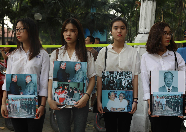 Các sinh viên cầm di ảnh cố Tổng bí thư trước cửa nhà tang lễ. Ảnh: Ngọc Thành