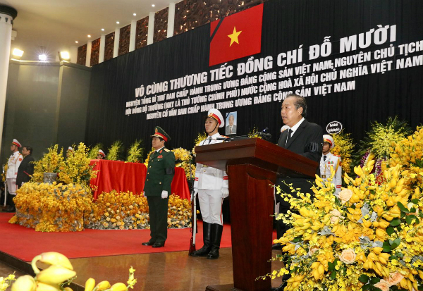 Tổng bí thư Nguyễn Phú Trọng đọc lời điếu, nêu bật “cố Tổng bí thư Đỗ Mười là nhà lãnh đạo xuất sắc, có uy tín lớn của Đảng, Nhà nước và nhân dân, người đảng viên cộng sản kiên trung cống hiến, hy sinh vì lý tưởng độc lập dân tộc và chủ nghĩa xã hội, vì hạnh phúc của nhân dân”.