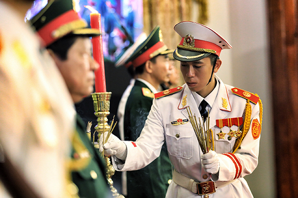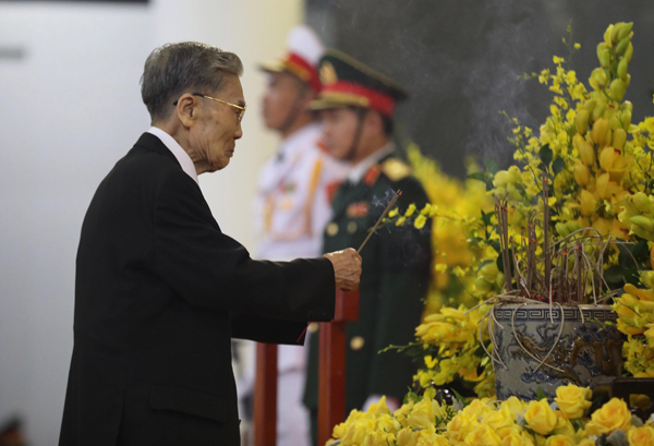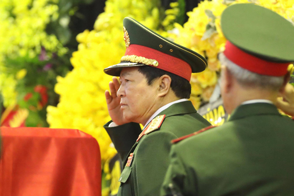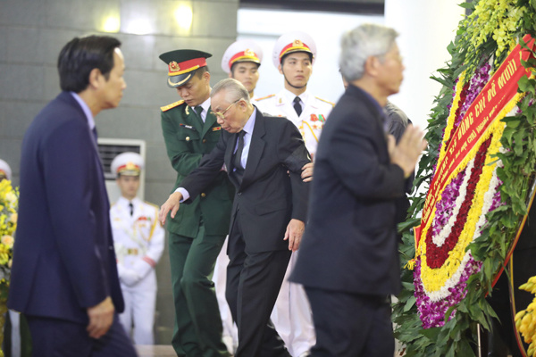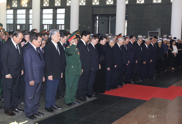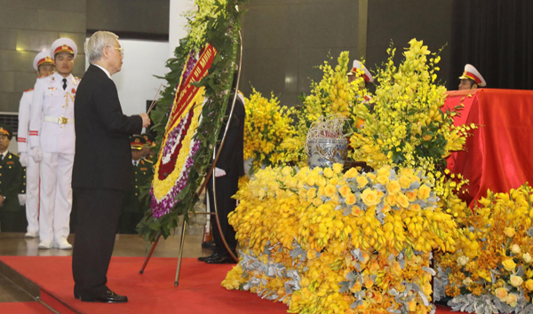 Chủ tịch Quốc hội Nguyễn Thị Kim Ngân, nguyên Tổng bí thư Nông Đức Mạnh, nguyên Thủ tướng Nguyễn Tấn Dũng và nhiều vị khác tay chắp trước ngực, hướng về phía linh cữu. Nguyên Phó chủ tịch nước Nguyễn Thị Doan đặt hai tay lên trên linh cữu phủ quốc kỳ. Bộ trưởng Công an Tô Lâm giơ tay chào nghiêm trang, hướng lên phía di ảnh. Nhiều người tay chắp trước ngực, đầu cúi thấp khi đi vòng quanh linh cữu cố Tổng bí thư.