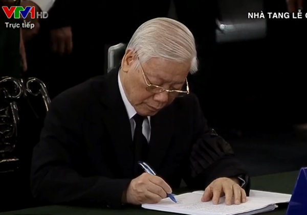 Tổng bí thư Nguyễn Phú Trọng ghi sổ tang. Ảnh chụp màn hình.