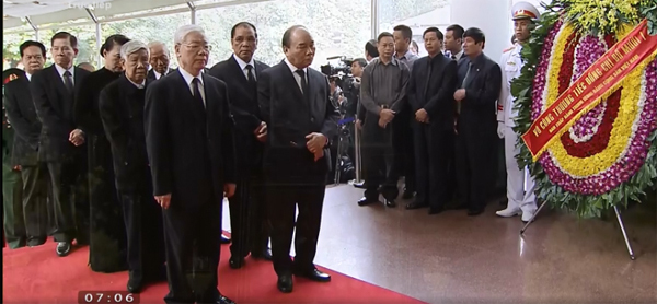 7h00: Tổng bí thư Nguyễn Phú Trọng, Thủ tướng Nguyễn Xuân Phúc, Chủ tịch Quốc hội Nguyễn Thị Kim Ngân cùng nhiều vị lãnh đạo, nguyên lãnh đạo Đảng, Nhà nước đã có mặt ở Nhà tang lễ để chuẩn bị bắt đầu lễ viếng chính thức.