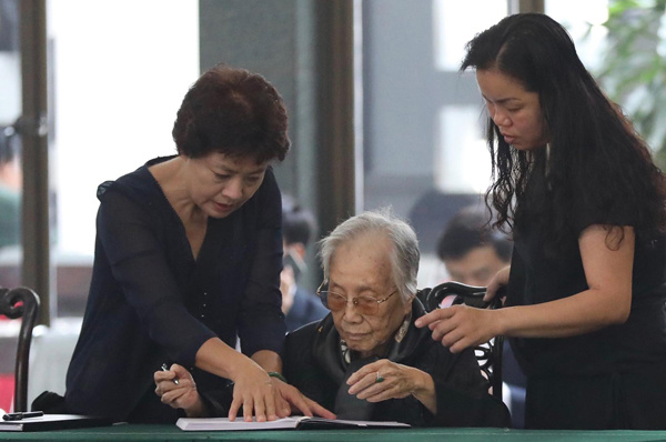 Nguyên Phó chủ tịch nước Nguyễn Thị Bình viết sổ tang. Ảnh: Ngọc Thành