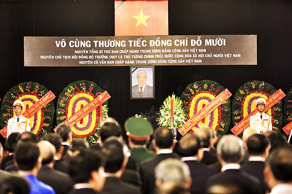 Tang lễ nguyên Tổng bí thư Đỗ Mười tổ chức theo nghi thức Quốc tang; linh cữu quàn tại Nhà tang lễ quốc gia số 5 Trần Thánh Tông, Hà Nội.