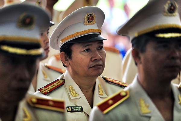 Bốn phía quanh linh cữu là bốn thành viên trong Ban lễ tang đứng nghiêm trang. Bộ trưởng Công an Tô Lâm, Trưởng ban Tuyên giáo Trung ương Võ Văn Thưởng đứng hàng trên.
