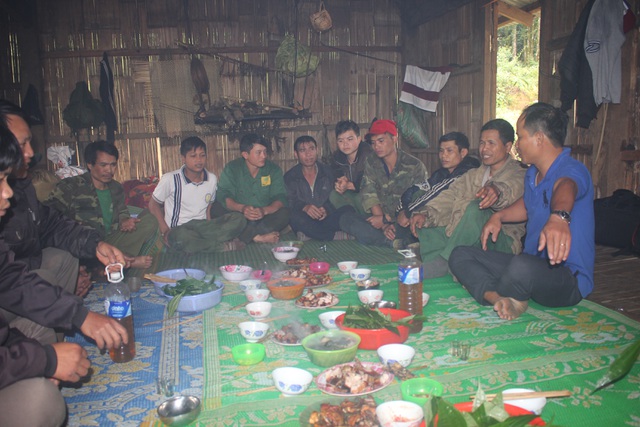 Sau một chuyến săn chuột rừng, chúng tôi về với Trung tâm xã Măng Ri. Chúng tôi được mời về một ngôi nhà sàn của bà con Xơ Đăng. Từ xa, một người phụ nữ Xơ Đăng đang cần mẫn ngồi châm lửa cho nồi rượu tết. Phía trên là những hàng măng rừng đã phơi khô…