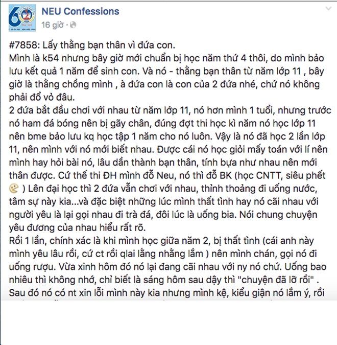 Đoạn confession có nội dung “Lấy thằng bạn thân vì đứa con - Tâm sự của 1 sinh viên làm mẹ từ khi 20 tuổi” hiện đang nhận được rất rất nhiều sự chú ý và tranh cãi trên trang NEU Confessions.