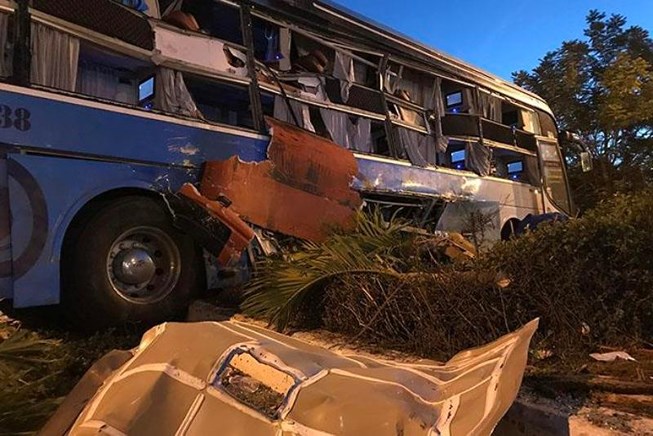 Cú tông mạnh khiến cả 2 xe văng xa, hư hỏng nặng. Đầu xe khách Phương Trang biến dạng sau tai nạn. Xe khách biển số Phú Yên leo lên dải phân cách.