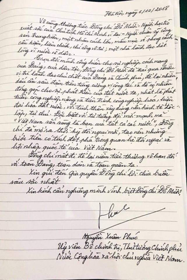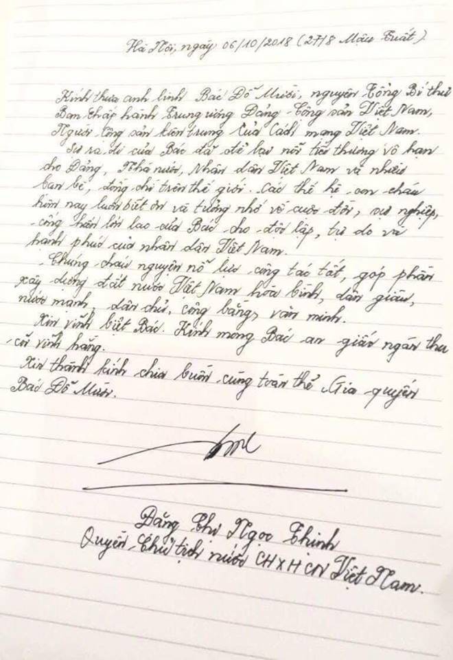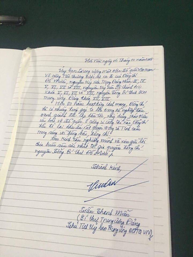 Trong sổ tang, Tổng Bí thư Nguyễn Phú Trọng đã viết: “Vô cùng thương tiếc đồng chí Đỗ Mười - Nhà lãnh đạo xuất sắc, có uy tín lớn của Đảng, Nhà nước và nhân dân ta.