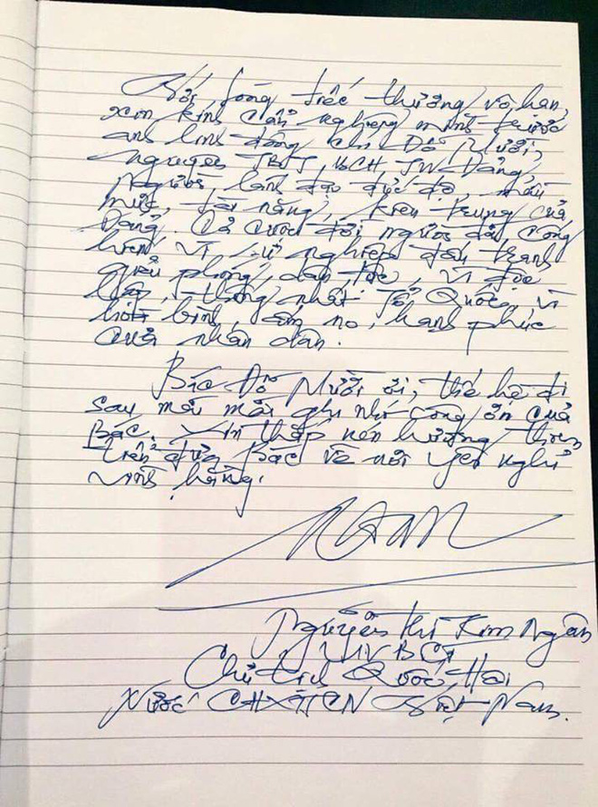 Chúng cháu nguyện nỗ lực công tác tốt, nỗ lực xây dựng nước Việt Nam giàu mạnh, dân chủ, công bằng, văn minh. Kính mong bác an nghỉ!”.