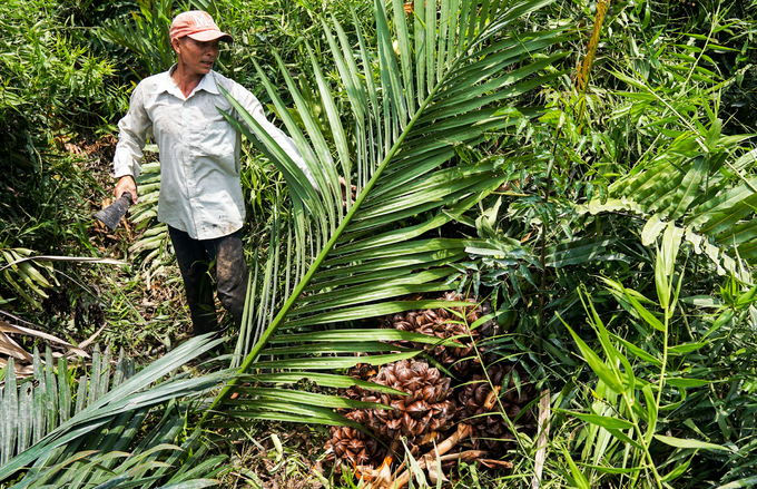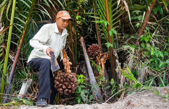 Mỗi tuần một lần, ông Lê Xuân Hưng (56 tuổi, huyện Cần Giờ, TP HCM) đều lội vào khu đầm lầy cách nhà 15 km để đốn trái dừa nước về bán.