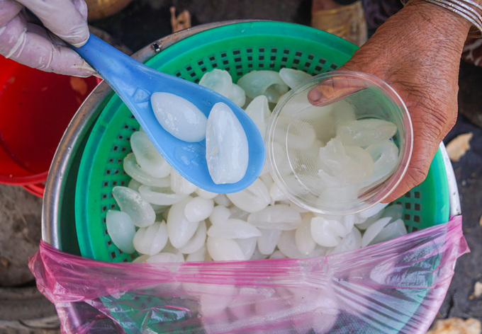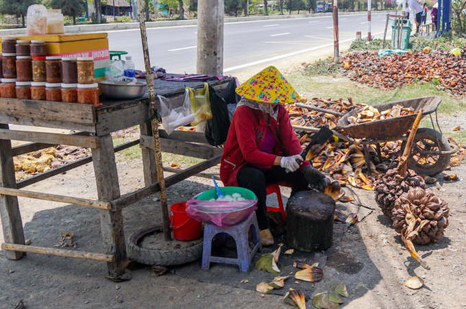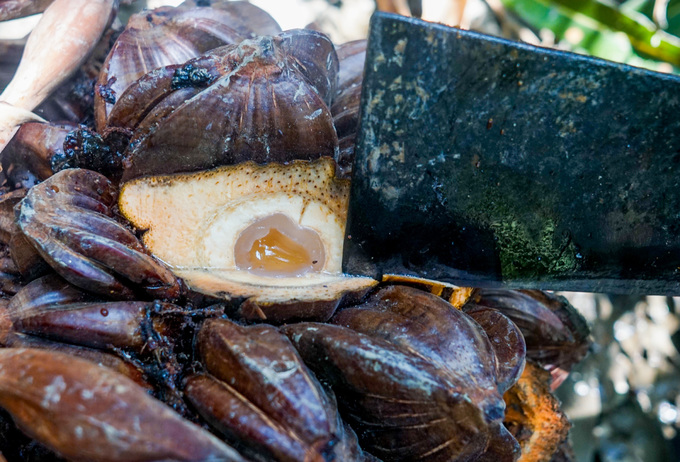 Người mua bổ trái lấy ruột pha với nước dừa xiêm làm thức uống giải khát hoặc bán với giá 30.000 đồng nửa cân dừa nước đã tách vỏ.
