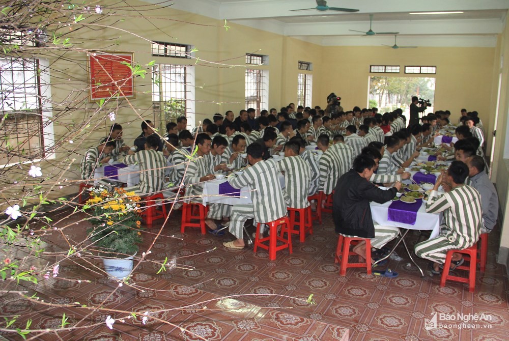 Được biết, đây là năm thứ 8 Trại giam Công an tỉnh Nghệ An tổ chức tất niên sớm cho các phạm nhân. Để tạo điều kiện cho các phạm nhân được đón Tết ấm cúng, lãnh đạo trại giam đã nâng mức khẩu phần ăn gấp 5 lần ngày thường.