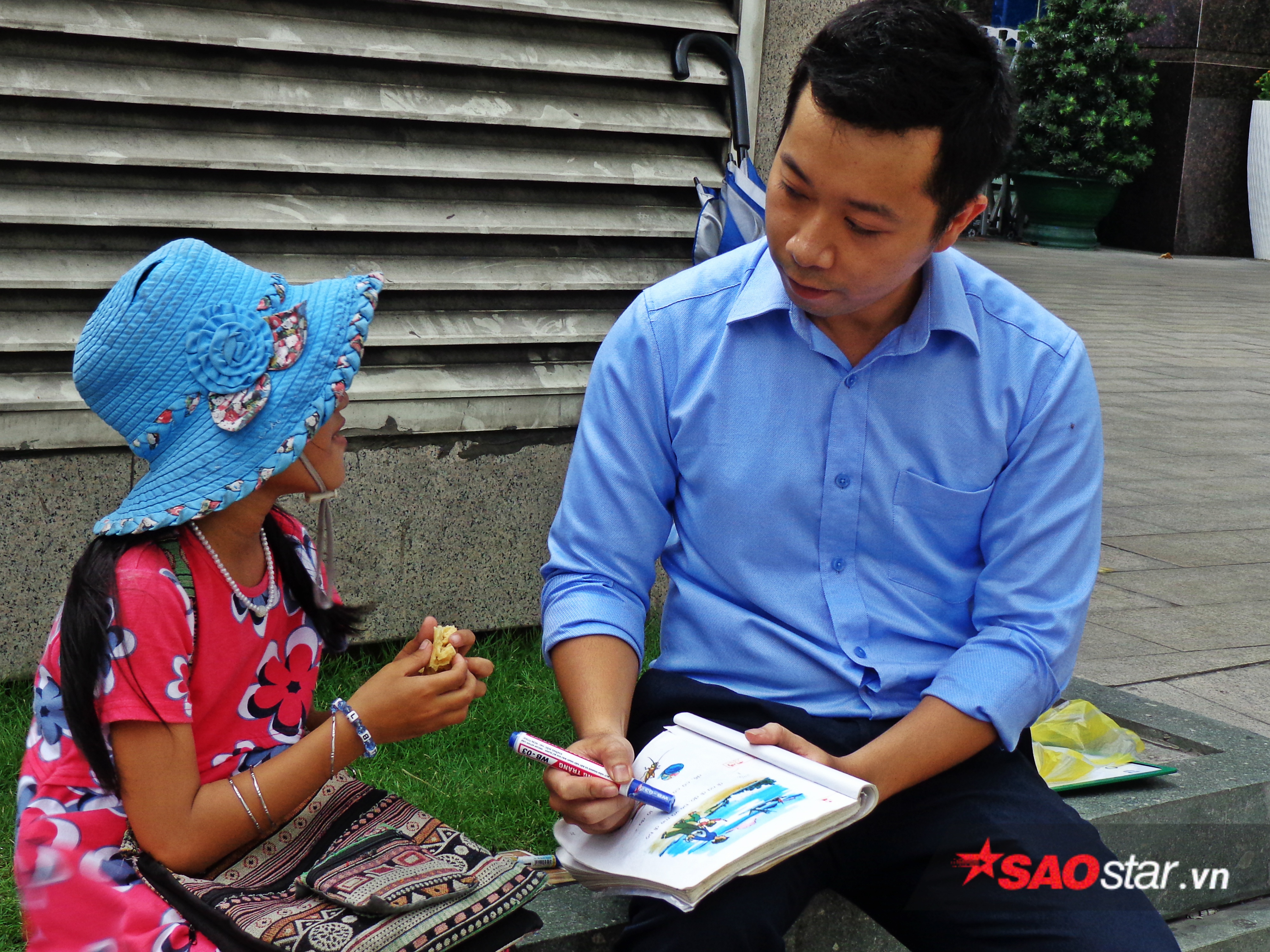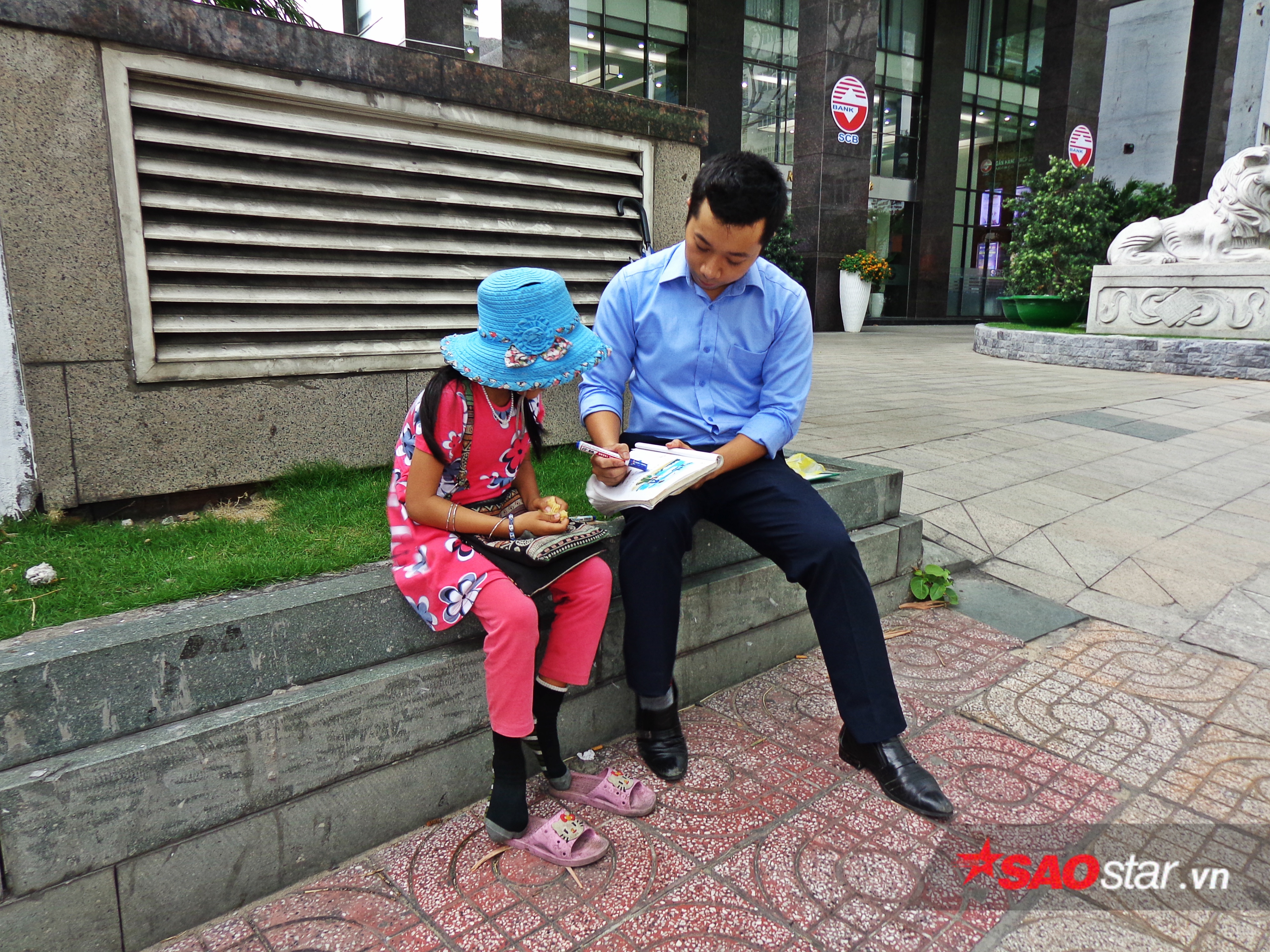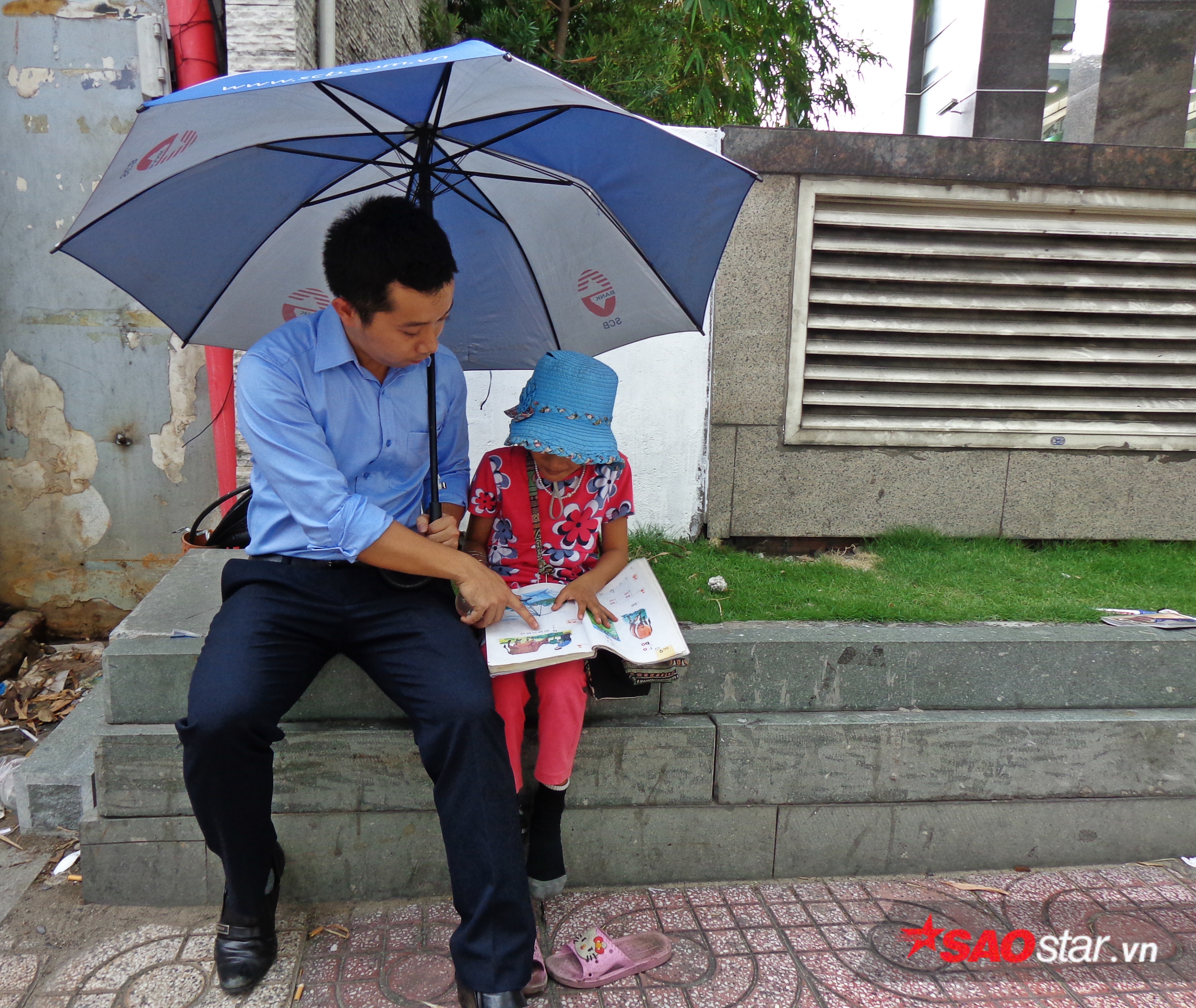 Giữa lòng Sài Gòn hiện đại, vẫn ngày ngày tồn tại một lớp học không bàn ghế, không bảng phấn, không balo và cũng không đồng phục… thậm chí, những điều cơ bản nhất của một lớp học cần có cũng là không. Thế nhưng, mỗi ngày vỉa hè của khuôn viên ngân hàng tại đường Trần Hưng Đạo vẫn đều đặn vang lên tiếng giảng bài say mê của một anh nhân viên văn phòng và giọng đánh vần ê a của cô học trò nhỏ mặt mày nhem nhuốc nép mình dưới bóng dù.