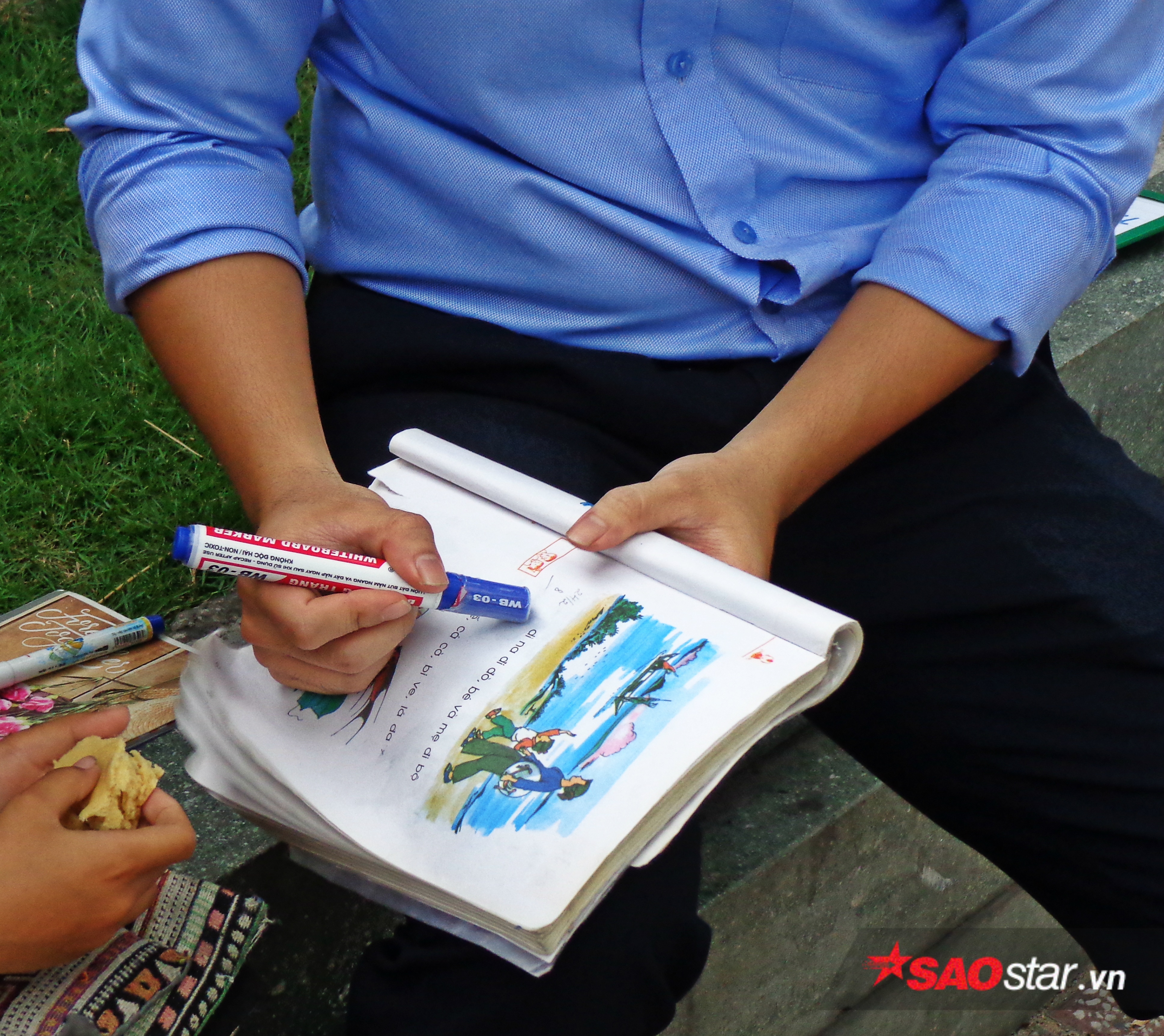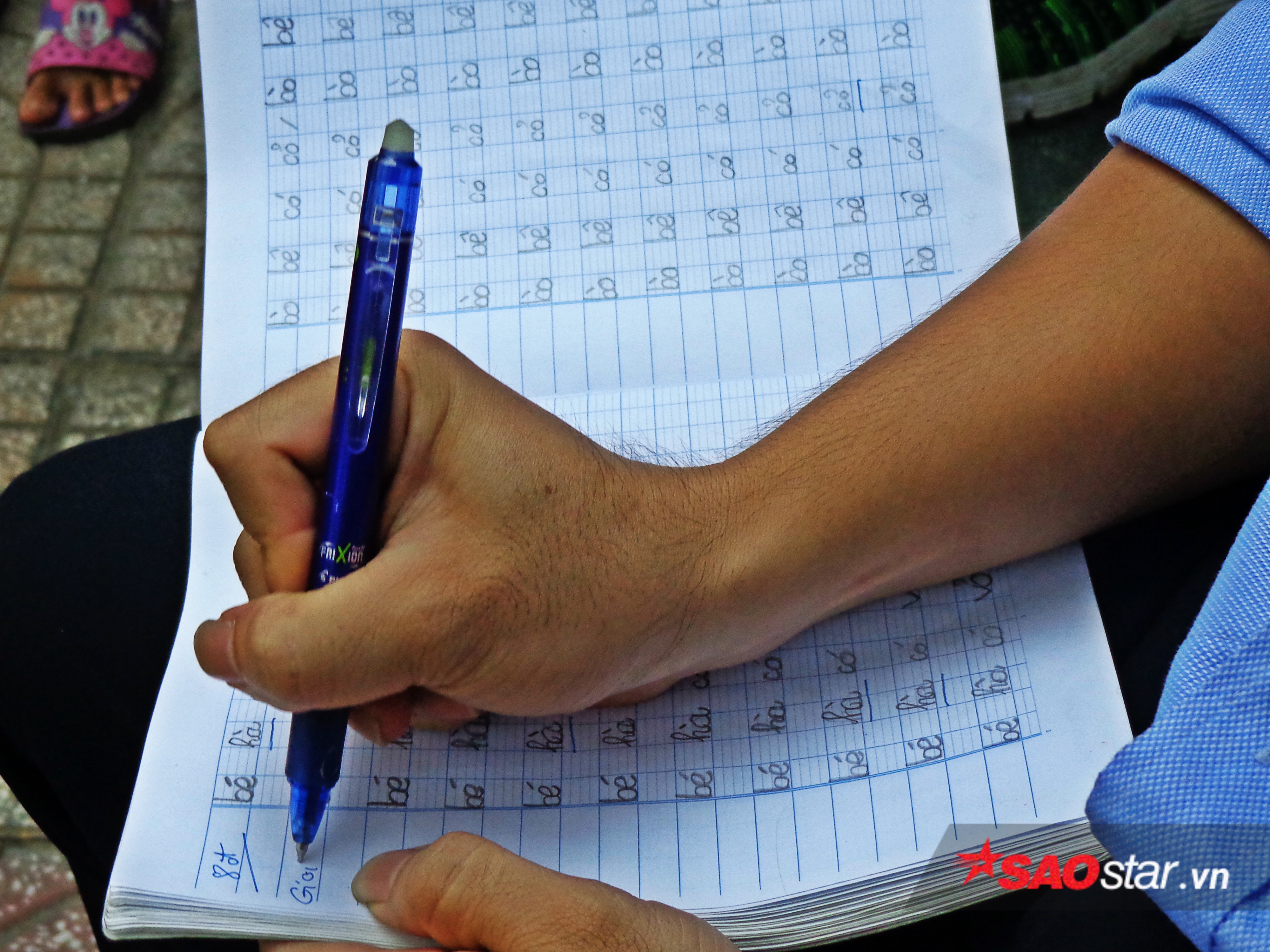 Nắng nóng đã có bóng dù còn khi mưa hai thầy trò ôm vội sách vở chạy vào sảnh ngân hàng để tiếp tục ê a từng con chữ. Lớp học chưa một ngày gián đoạn và trang vở dần được lắp đầy bằng những nét chữ chưa tròn và những lời nhận xét tâm huyết của “thầy”. “Tôi viết những lời nhận xét lên vở thế thôi, nhưng bé cũng đã đọc hiểu được đâu. Phần vì để chị hai của bé về nhắc nhở thêm, phần là để sau này khi đã rành rọt hơn bé có thể xem lại quá trình học của mình”.