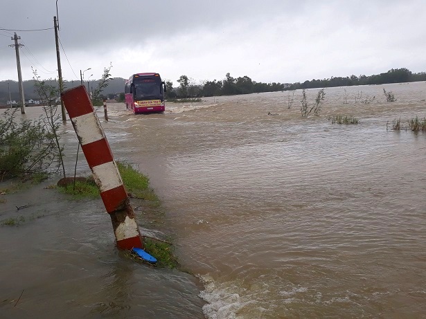 Xe khách băng qua dòng nước lũ ở Bình Định.