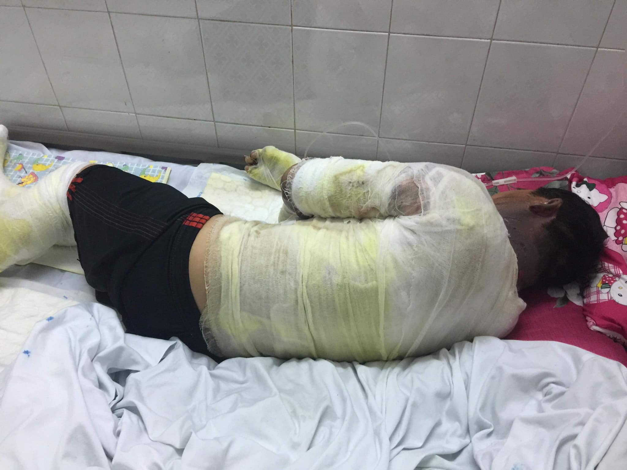 Lúc đó, bên cạnh chị và chồng là anh Nguyễn Văn Linh (SN 1969) có can xăng 5 lít để gần máy cắt cỏ. Ngọn lửa bén vào can xăng phát nổ. Vụ tai nạn làm chị Hồng bị bỏng nặng đến 90% còn anh Linh bị bỏng 30%. Vụ nổ cũng gây cháy ở khu vực lán trại, nhưng được người dân kịp thời dập tắt.