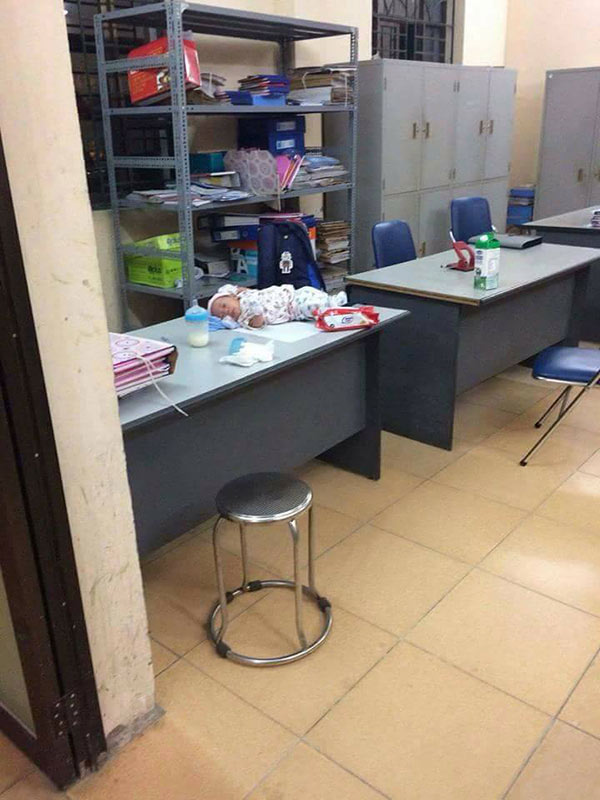 Bella để con tuổi nằm trơ trọi tại đồn cảnh sát, cạnh bên là hộp sữa tươi (loại sữa không phù hợp cho trẻ sơ sinh).