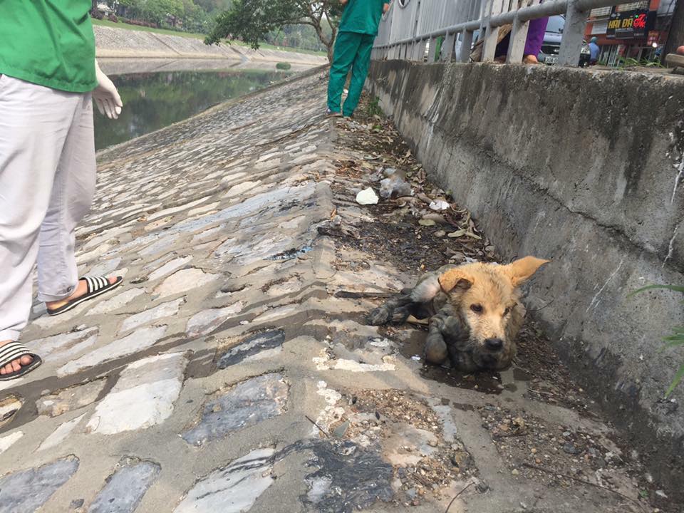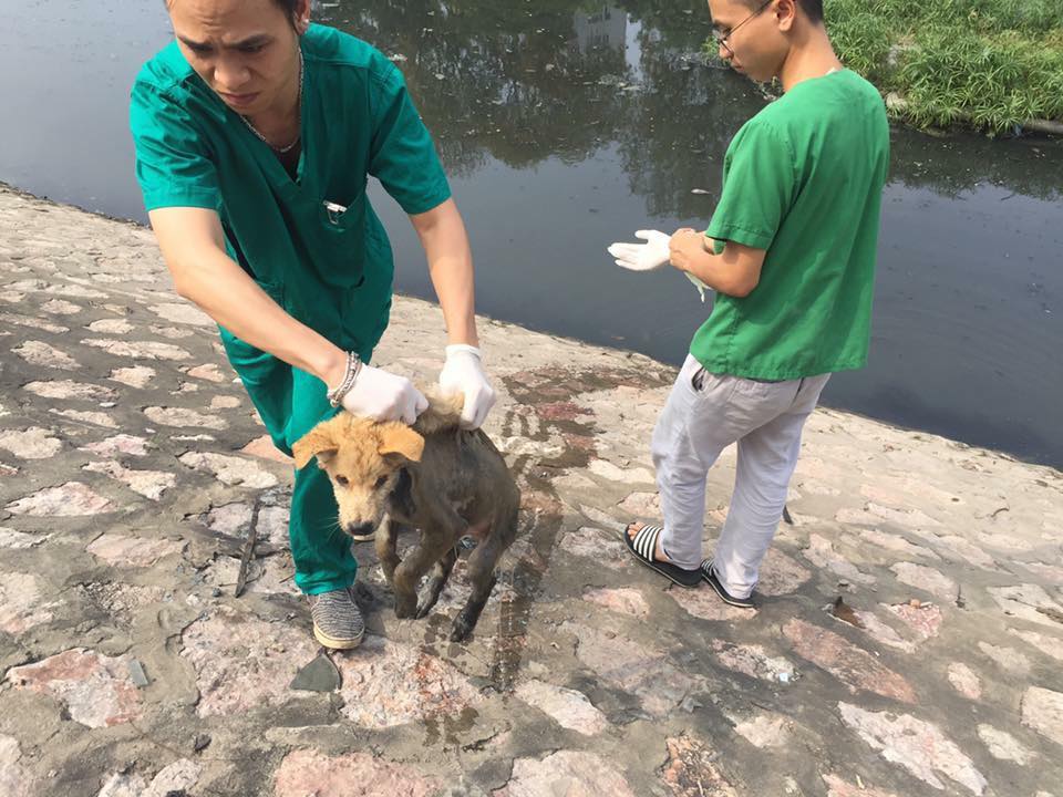 Chú chó tội nghiệp bị chủ nhân thẳng tay vứt xuống sông Tô Lịch sau khi khám bệnh.