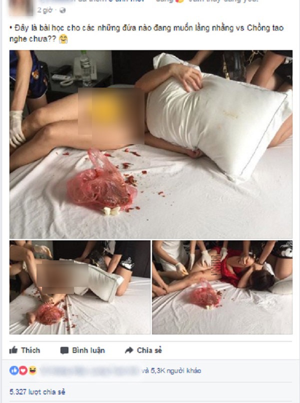 Sau khi trút giận hả hê, người vợ còn đăng tải hình ảnh trên trang cá nhân kèm theo dòng trạng thái: “Đây là bài học cho những đứa nào đang muốn lằng nhằng với chồng tao nghe chưa?”. Được biết, cô vợ trẻ đang mang thai 3 tháng và trong suốt 7 tháng qua, cô đã nghi ngờ chồng mình (anh C.K - 24 tuổi) lăng nhăng bên ngoài vì thỉnh thoảng vẫn không liên lạc được trong suốt nhiều giờ.