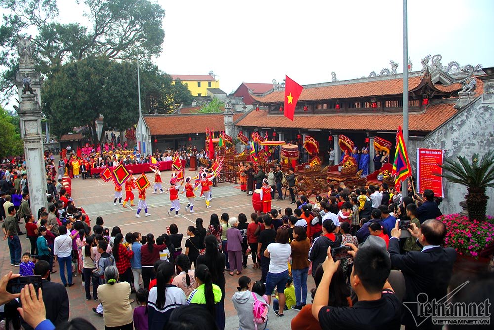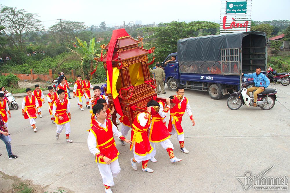 Đoàn rước kiệu đi từ 9h về đến đình lúc hơn 13h nhưng cũng chưa được nghỉ ngơi vì lúc này kiệu từ các làng khác sẽ ngẫu hứng sang chào hỏi, làm lễ với làng