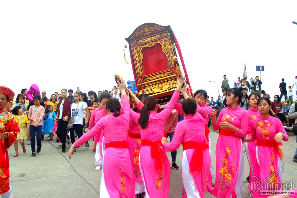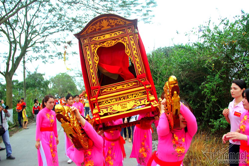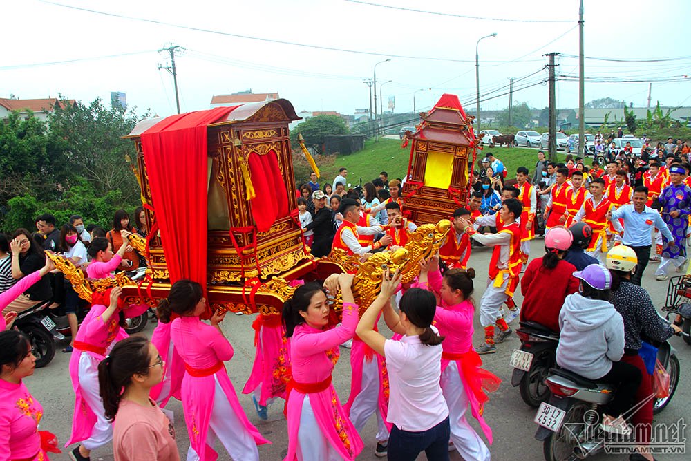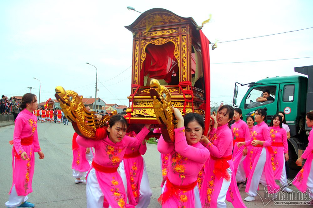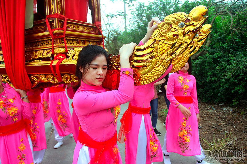 Màn rước kiệu thu hút sự chú ý của hàng nghìn người. Em Hà Kiều (17 tuổi) cho biết đây là lần đầu em tham gia khiêng kiệu, thấy rất lo lắng hồi hộp, tuy nhiên cũng vinh dự vì được lựa chọn. Kiệu rất nặng nên em và 18 bạn nữ khác phải khởi động kỹ trước khi khiêng để không bị chuột rút