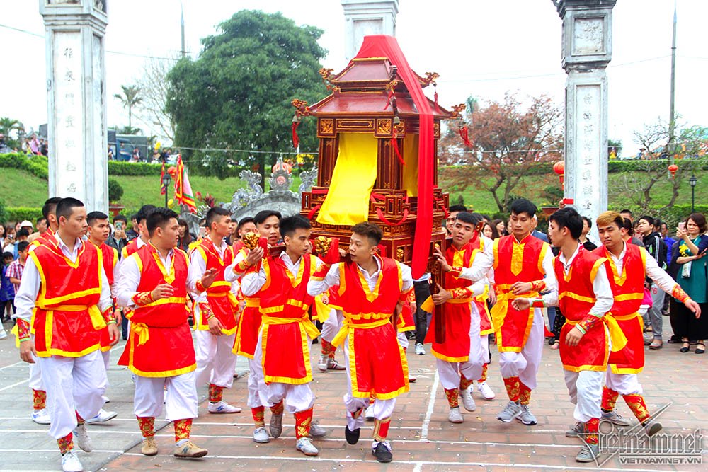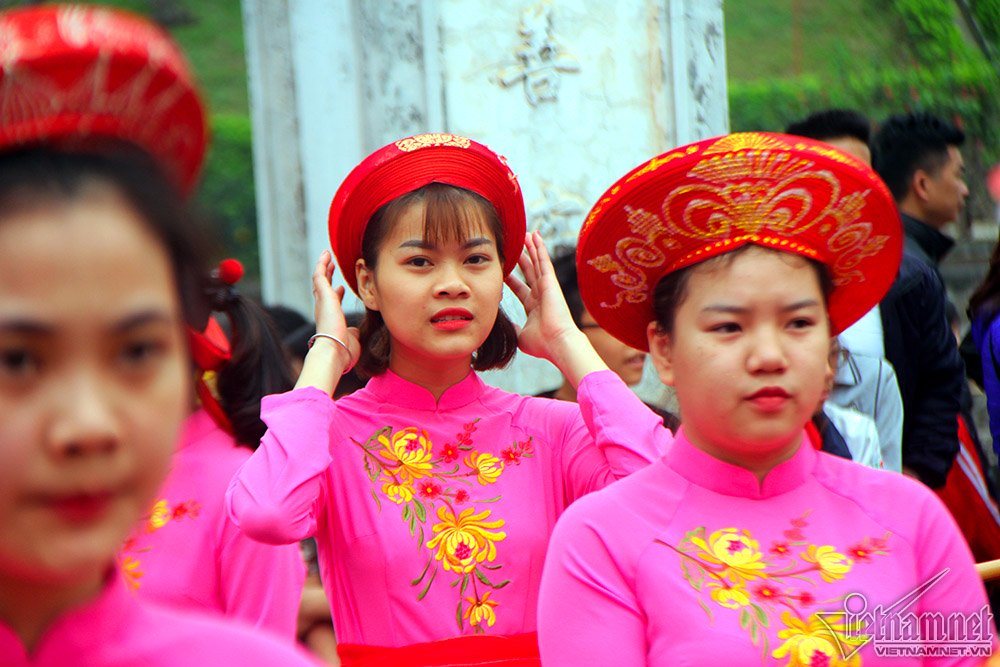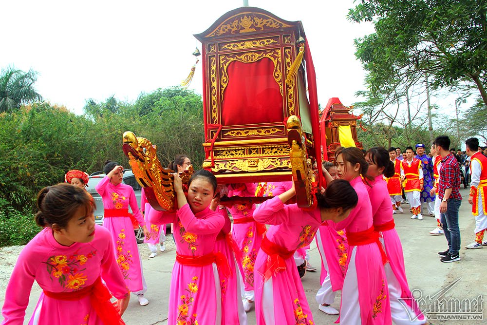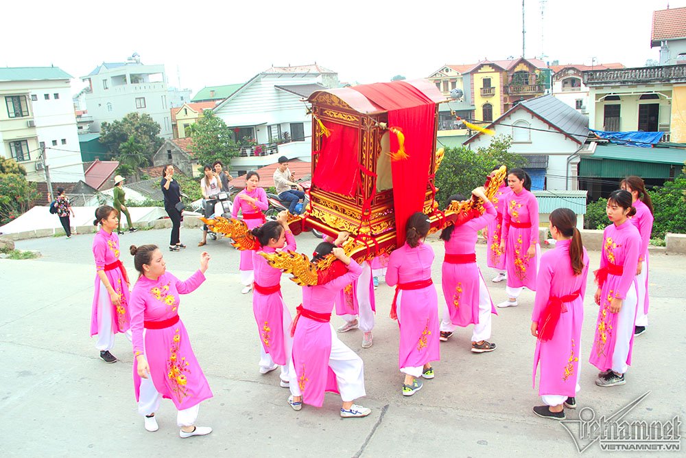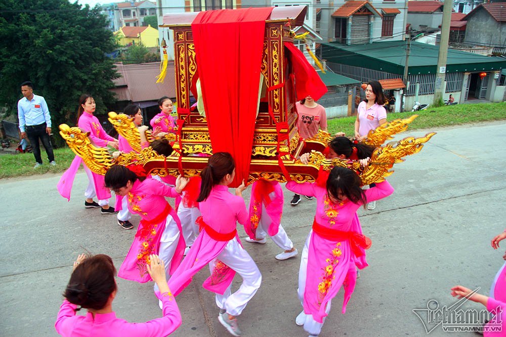 Màn rước kiệu thu hút sự chú ý của hàng nghìn người. Em Hà Kiều (17 tuổi) cho biết đây là lần đầu em tham gia khiêng kiệu, thấy rất lo lắng hồi hộp, tuy nhiên cũng vinh dự vì được lựa chọn. Kiệu rất nặng nên em và 18 bạn nữ khác phải khởi động kỹ trước khi khiêng để không bị chuột rút