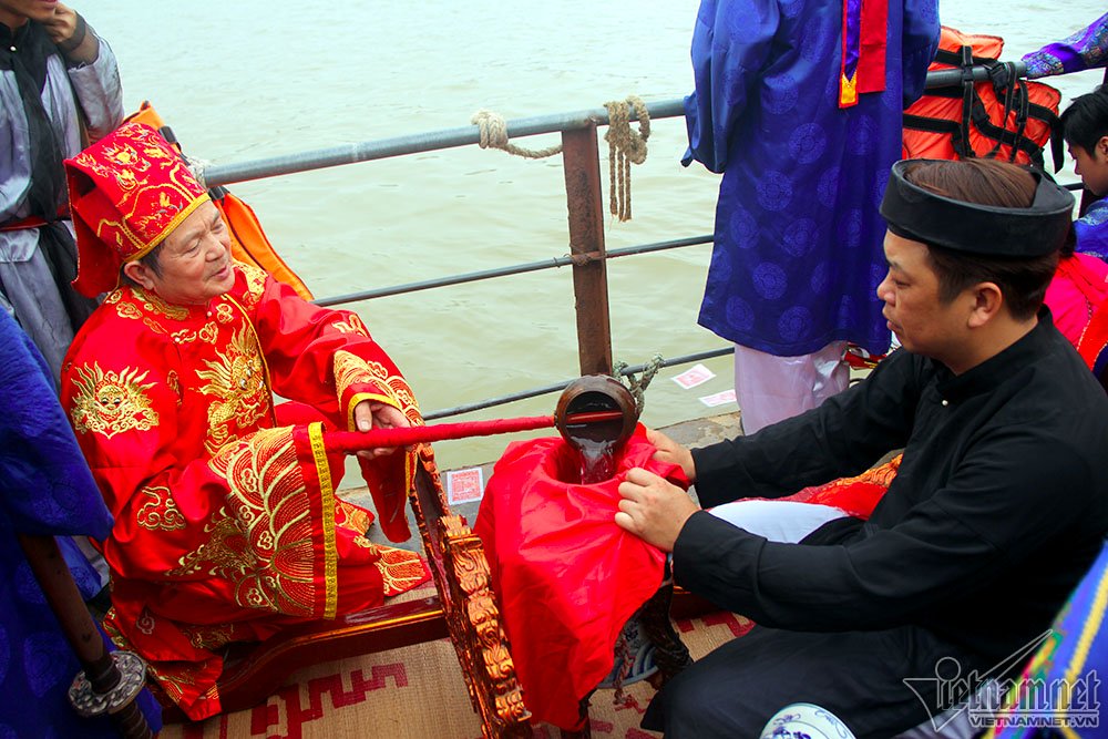 Đại diện cho các bô lão trong làng múc nước giữa sông Hồng lấy nước tinh khiết của trời đất đổ đầy vào chóe. Địa điểm được chọn phải là chỗ sâu nhất, tinh khiết nhất sông, múc đủ 37 gáo thì đầy chóe. Lúc này, các cô gái rước kiệu đã được nghỉ
