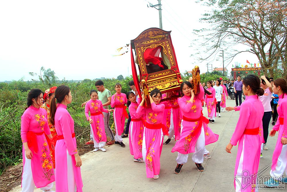 Theo làng truyền lại, kiệu Ông tức thành hoàng Đào Duy Trinh do 10 nam thanh niên khiêng và nhị vị Bà tức Xuân Dung phu nhân và Tùng Hoa phu nhân - hai phu nhân của vị Thành hoàng do 8 cô gái khiêng