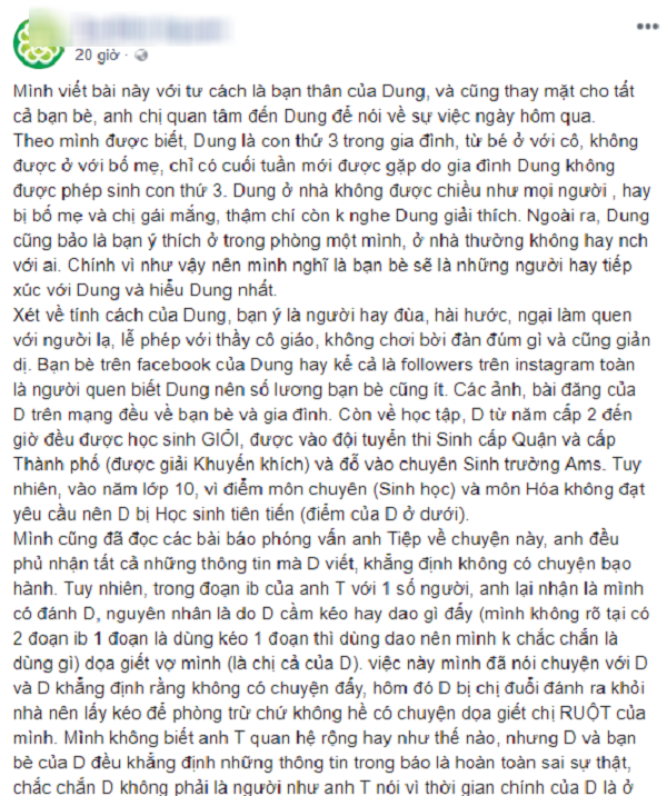 Cụ thể thông tin trên này viết: “Vào ngày 26/5 vừa qua, D. một cô gái 16 tuổi người Việt Nam đăng tải trên trang Facebook cá nhân câu chuyện cô bị anh rể - chồng của chị gái - bạo hành, người mà cô gọi là “nó” trong bài viết. Hầu hết mọi người đều bênh vực D. và lên án người ngược đãi cô - một MC nổi tiếng. Hôm nay là ngày đầu tiên trong kỳ nghỉ hè, nhưng cha mẹ của D. đã đưa cô về quê ở Ninh Bình, nơi cô phải cách xa bạn bè ở Hà Nội 90km. Mặc dù vậy, D. nói với bạn bè rằng cô cảm thấy an toàn hơn khi ở đây.