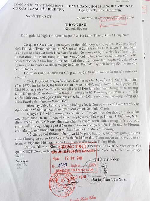 Tuy nhiên, ngày 4/10/2016, chị Thuận gửi đơn tố cáo chị Đào đăng hình ảnh sai sự thật. Ngày 6/10, Công an huyện Thăng Bình đã điều tra và kết luận con chị Đào sử dụng điện thoại của mẹ để quay phim, chụp ảnh chiếc bánh cùng một con vật bò trên chiếc bánh và đăng nội dung bánh Trung thu Hoa Sen có dòi lên Facebook của mẹ mình. Khi công an xác minh thì chiếc bánh vật chứng không còn.