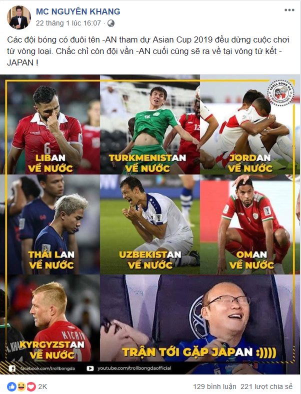 Kèm theo bức ảnh, chàng MC tài ba này hóm hỉnh: “Các đội bóng có đuôi tên “AN” tham dự Asian Cup 2019 đều dừng cuộc chơi từ vòng loại. Chắc chỉ còn đội vần “AN” cuối cùng sẽ ra về tại vòng tứ kết - Japan”.