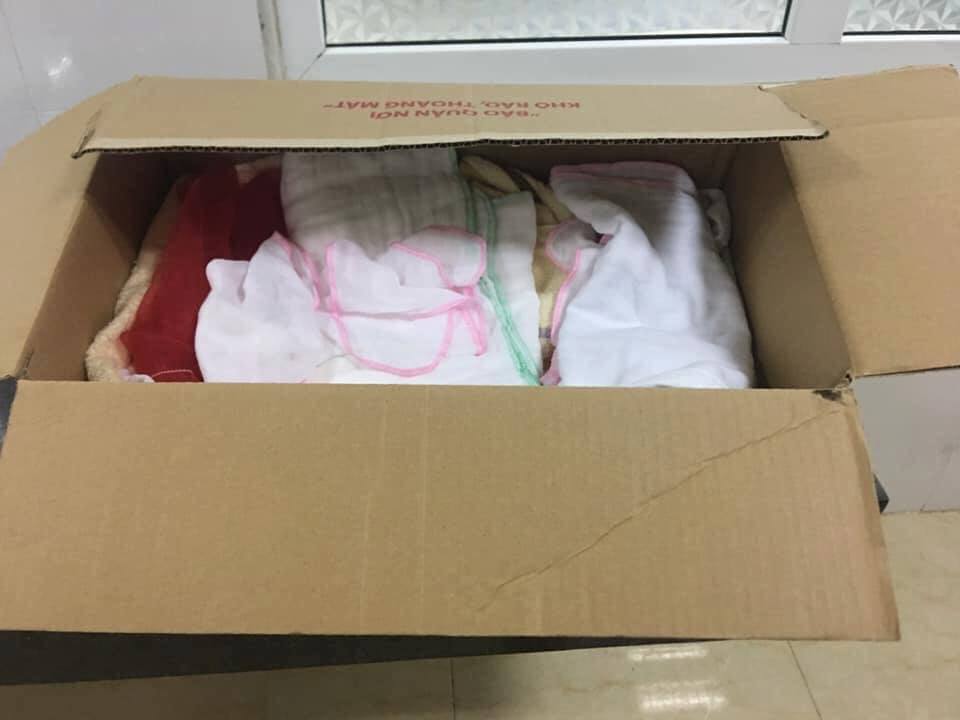 Chiếc thùng giấy nơi để cháu bé kèm một số tã lót.