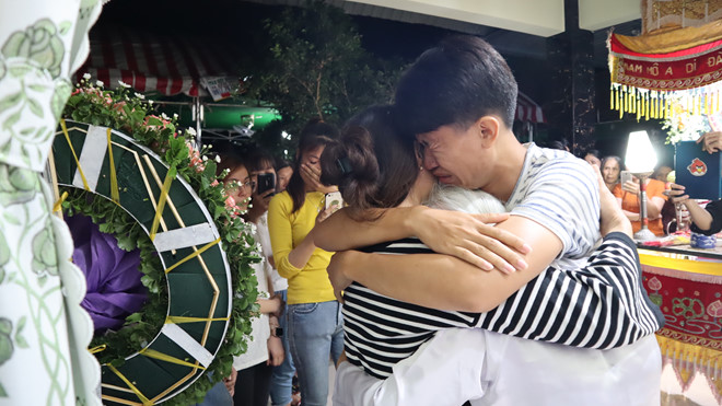 Ân ôm chầm lấy hai người mẹ và bật khóc trong “tang lễ hoa trắng”. Ảnh: Thanh Niên.