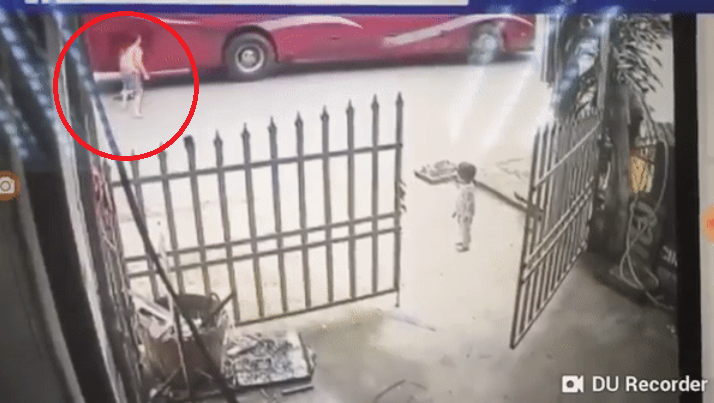 Theo đoạn clip ghi lại, 2 bé trai cùng chơi đùa và tự ý mở cửa cổng, lúc này một bé bất ngờ chạy ra đường, đúng lúc chiếc xe khách chạy tới đã tông trúng người. Người mẹ phát hiện chạy ra nhưng không kịp xử lí.