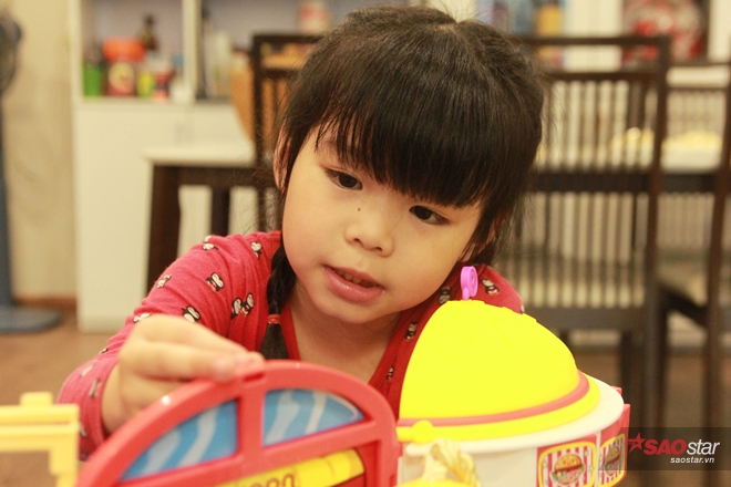 Vẻ tập trung của bé Miu khi lắp ghép ngôi nhà đồ chơi.