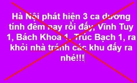 Trước đó, ngày 07/3, Công an huyện Chương Mỹ đã phát hiện tài khoản facebook “M.T.A.K” đăng tải nội dung: “…Hà Nội phát hiện 3 ca dương tính đêm nay rồi đấy, Vĩnh Tuy 1, Bách khoa 1, Trúc Bạch 1, ra khỏi nhà tránh các khu ấy ra nhé, chồng chị vừa đi họp khẩn về xong, run quá”.